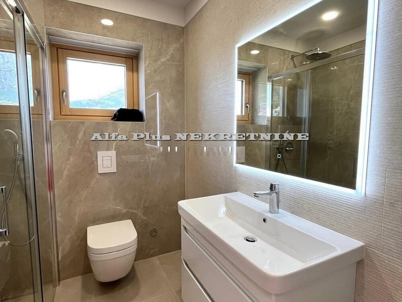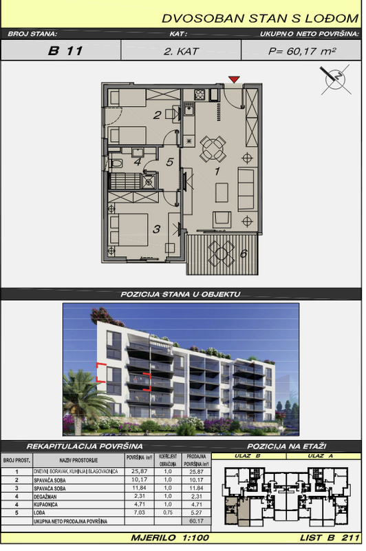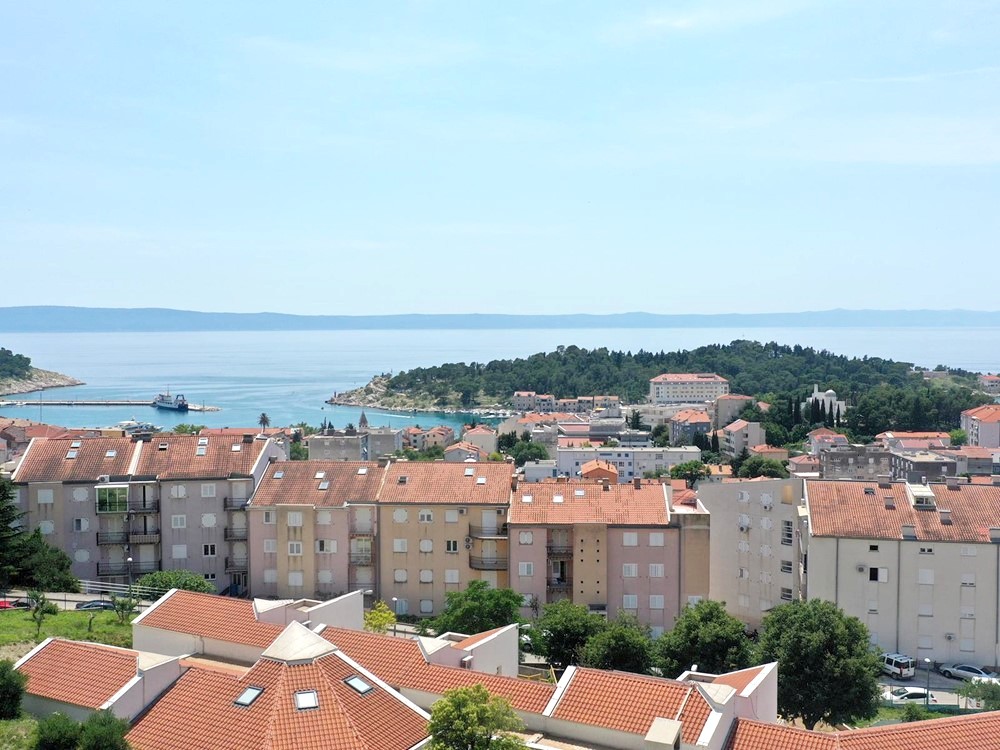 Predmet prodaje odnosi se na potpuno novi dvosobni stan B-11 u NOVOGRADNJI u centru Makarske. Stan je površine 60 m2, položen na drugom katu nove luksuzne stambene zgrade . Stan se sastoji od dnevnog boravka, kuhinje i blagovaonice, dvije spavaće sobe, kupaonice, degažmana i lođe. Orijentacija stana je južna . Pogled iz stana je spektakularan i pruža se na more, otoke i grad . Zgrada se sastoji od podruma koji ima dvije etaže ( -1 i -2 u kojima su garažna mjesta ), visokog prizemlja i 4 kata. Ukupno 40 stanova raspoređeno je u dva ulaza s liftovima . Na svakom katu nalaze se 4 stana. U prizemlju objekta nalaze se ostave. Najkvalitetnija izgradnja! ( Izolacija s kamenom vunom debljine 8 cm, unutar stanova dodatna izolacija, podizno klizne stijenke velikih dimenzija s termoizolacijskim staklima, ulazna vrata sigurnosna „Blindo“ protupožarna, a unutarnja furnirana vrata 1. klase, bijele boje, led rasvjeta, sve sobe klimatizirane, u stubištima brački kamen i inox ograda, u kupaonicama podno grijanje, visokokvalitetna keramika – Kerlite ploče dimenzija 2,40 mx 1,25 m, kvalitetni kupaonski ormarići s umivaonikom i viseće wc školjke sa „soft – close“ daskama na „walk – in“ principu sa staklenim tuš kabinama ) Kupnja garažnog parking mjesta je uvjet uz kupnju stana. Cijena garažnog parking mjesta iznosi 35 000 €. Vrhunski materijali i detalji koji stambeni prostor čine kvalitetnijim i ugodnijim su odlike ovog projekta u centru Makarske.
