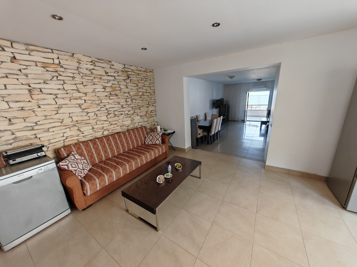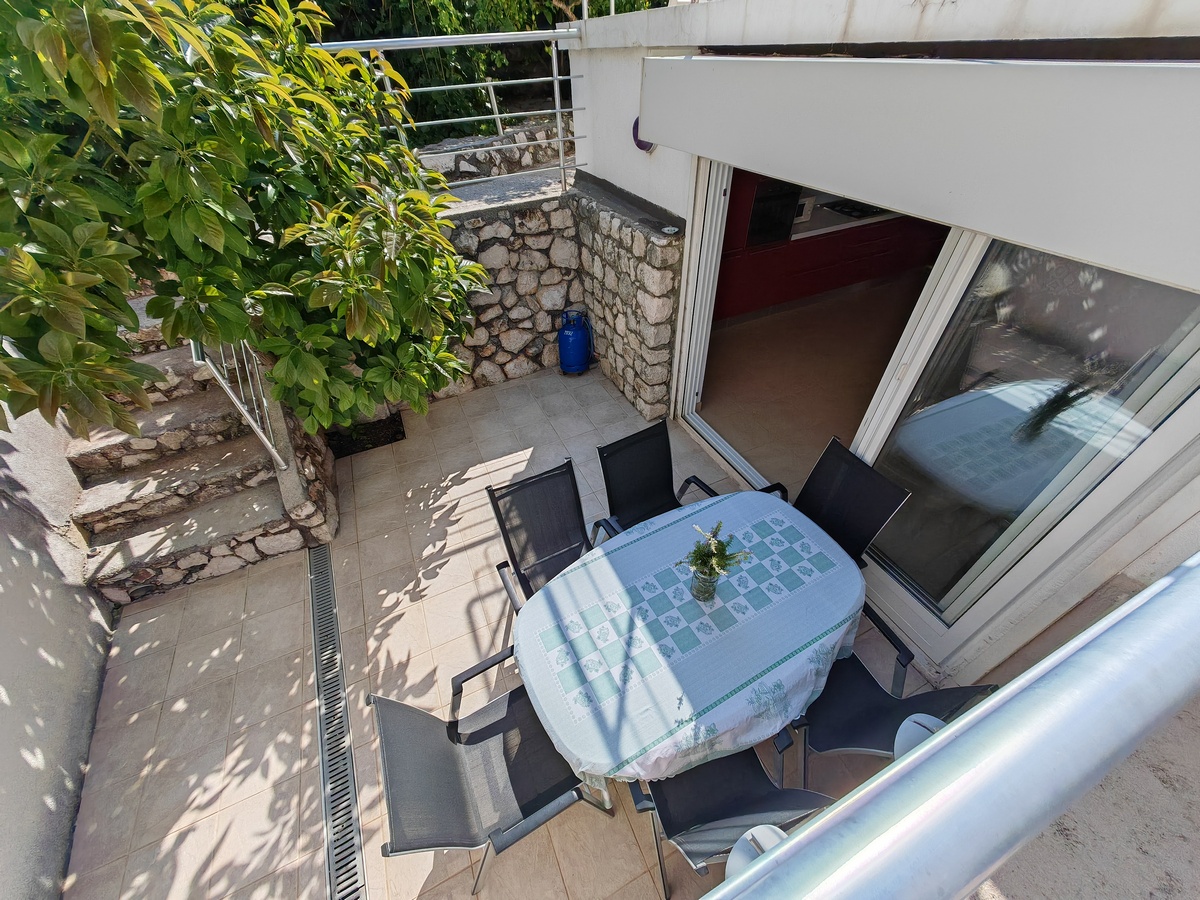 Na prizemlju je prostrani dnevni boravak s kuhinjom i blagovaonicom, kupaonica i velika terasa.