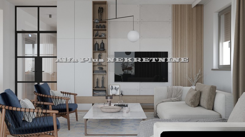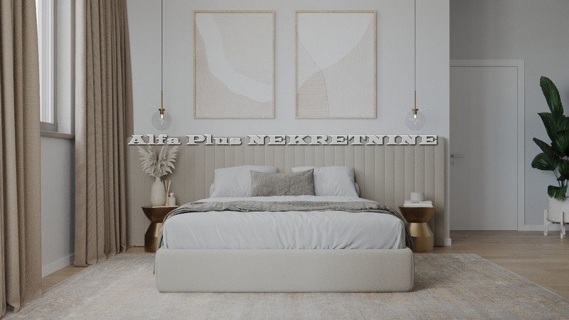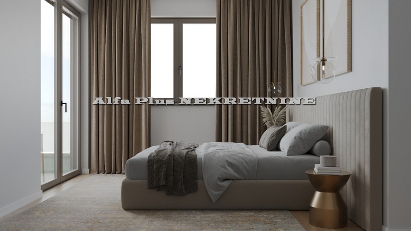 sastoji se od: kupaonice, dvije spavaće sobe, dnevni boravak sa kuhinjom i blagovaonicom, dva balkona.
